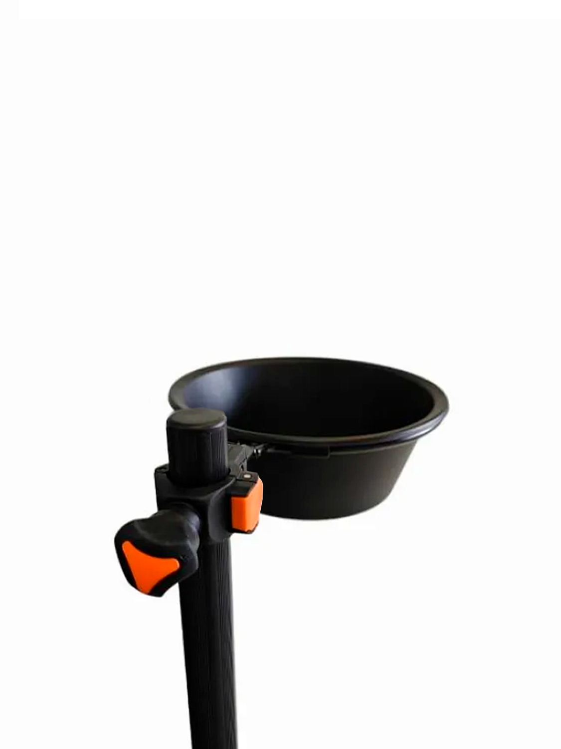 -- Элемент крепится на стальной обод, является быстросъемным и дает возможность быстро наполнить емкость очередной порцией прикормки из основной емкости для прикормочной смеси или сменить воду для ополаскивания рук.